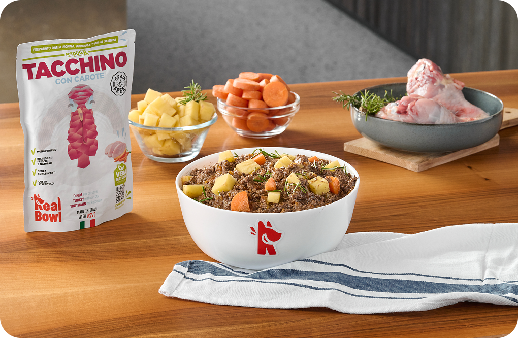 sono cuoca e so riconoscere un intruglio da una pappa ben cucinata, e questa è una pappa superlativa!I miei cani sono anziani e avevano una serie di problemi al pelo e agli intestini che non riuscivo a risolvere.Con Realbowl ho risolto tutto! Grazie anche a chi risponde al telefono con gentilezza,pazienza e professionalità.Da consigliare a tutti !!!!!Dimenticavo:consegna veloce e puntuale!!!! meglio di così !!!!!